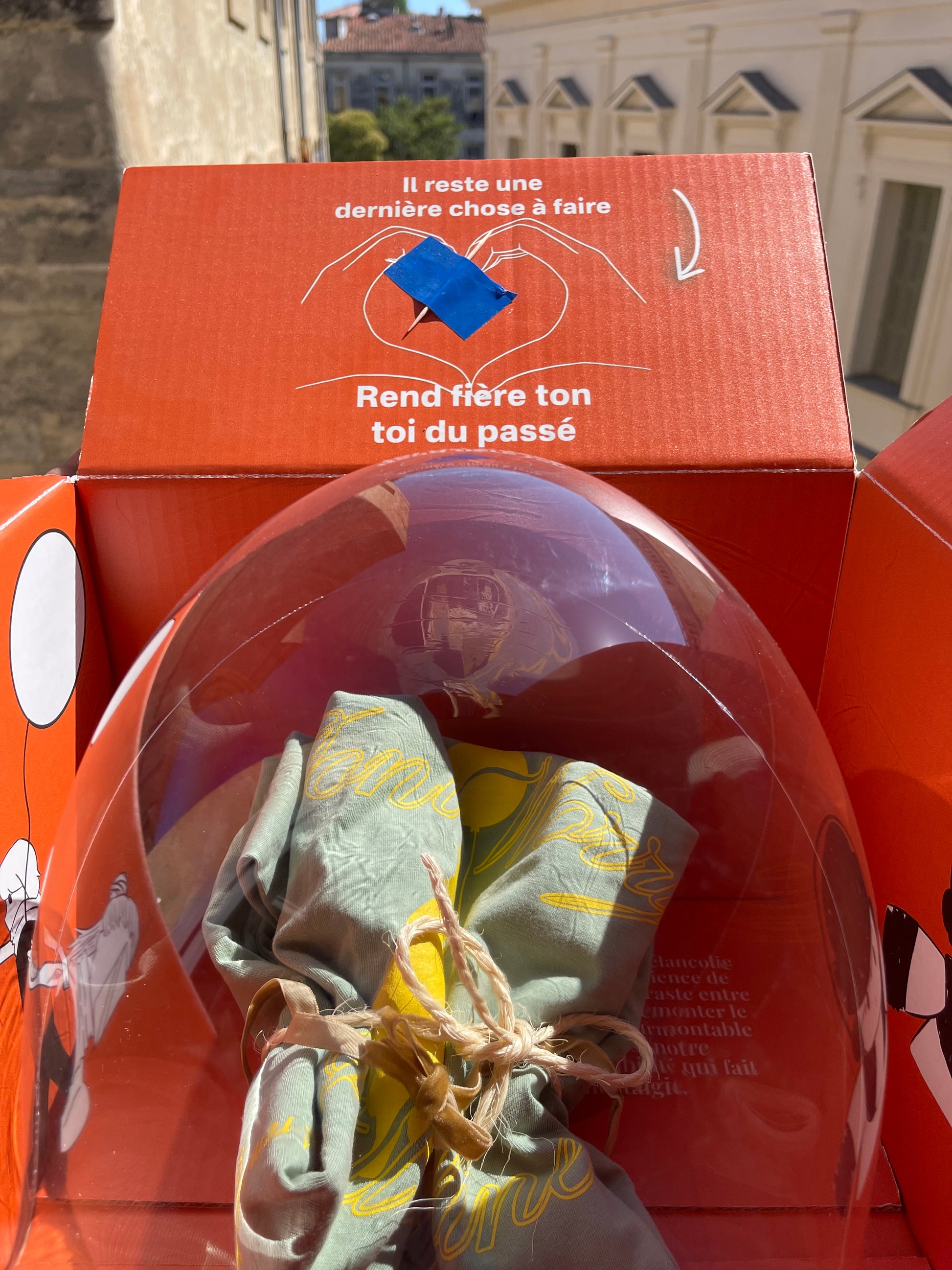 Une nouvelle expérience, recevez votre tee dans un ballon, représentation de l'enfance, à vous de le faire éclater en faisant la promesse de rendre fière votre vous du passé.
